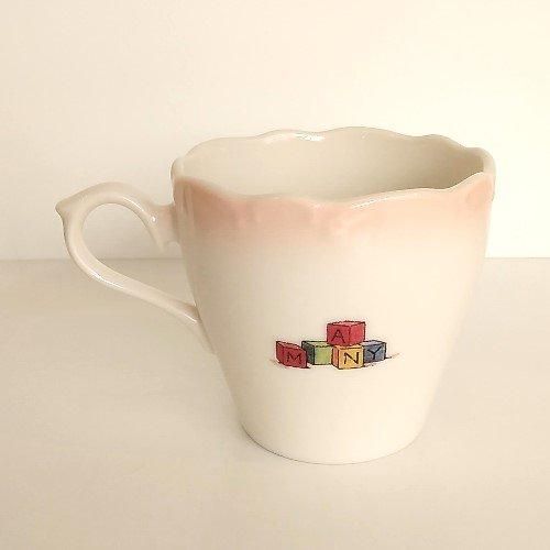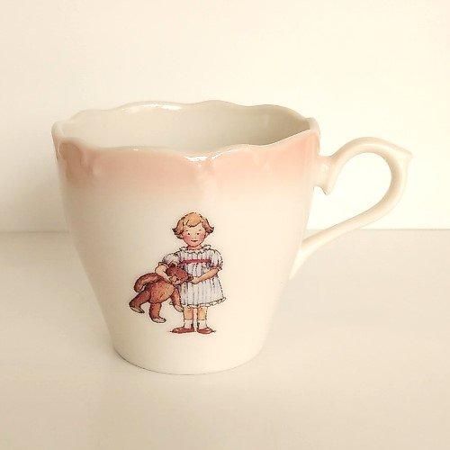 カップの正面にはテディベアを抱えた女の子、反対側には積み木がデザインされています。