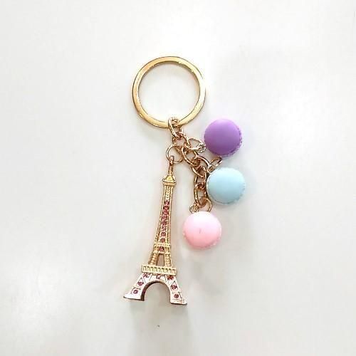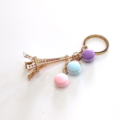 4面のうち1面にピンクのラインストーンの付いたエッフェル塔と、パステルカラーの可愛らしいマカロンが付いたキーホルダーです。